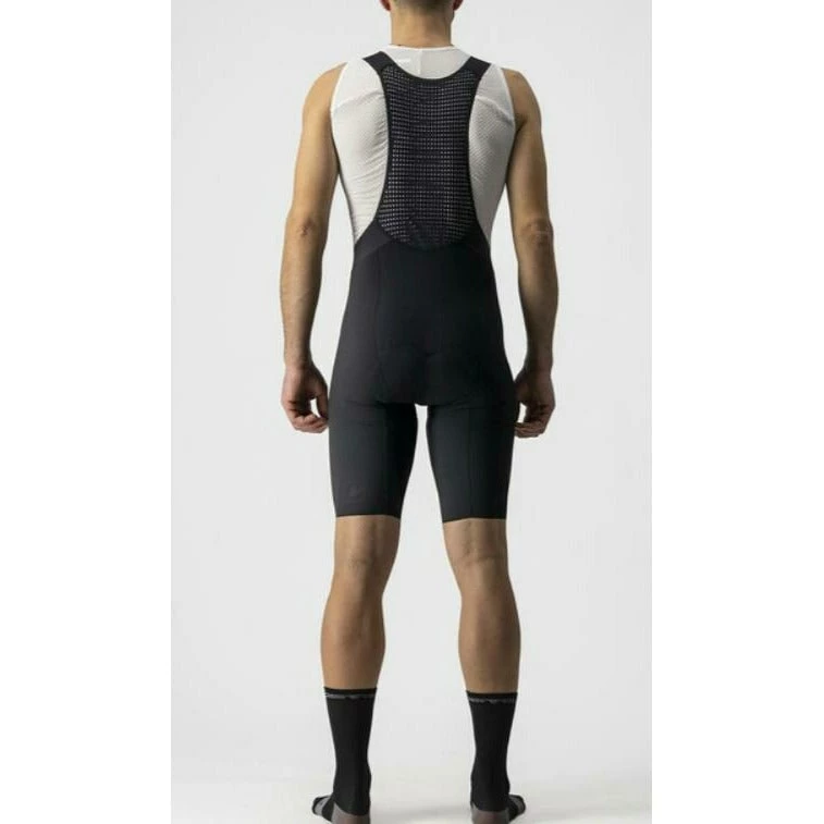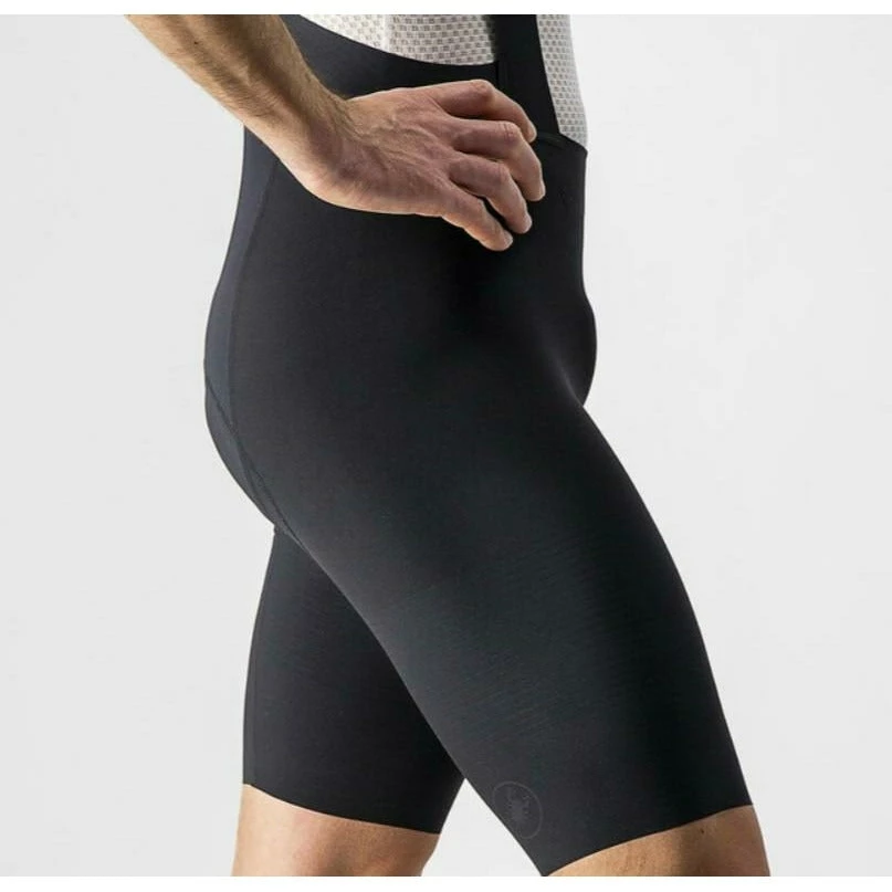 The premium fabrics of the Castelli Premio Cycling Bibshort extend the bib straps. The perforated back keeps you cool and the edge is bonded so you don’t feel the thickness of a stitched edge. The elastic straps have just enough modulus (return) to hold your shorts securely in place without cutting in to your shoulders. We’ve carried the less-is-more theme into the design, with minimalist laser-etched logos and subtle finishing. It looks as premium as it feels. You can tell that every component, every stitch, every detail has been obsessed over. You’ll not find a better bibshort. WHAT IT IS