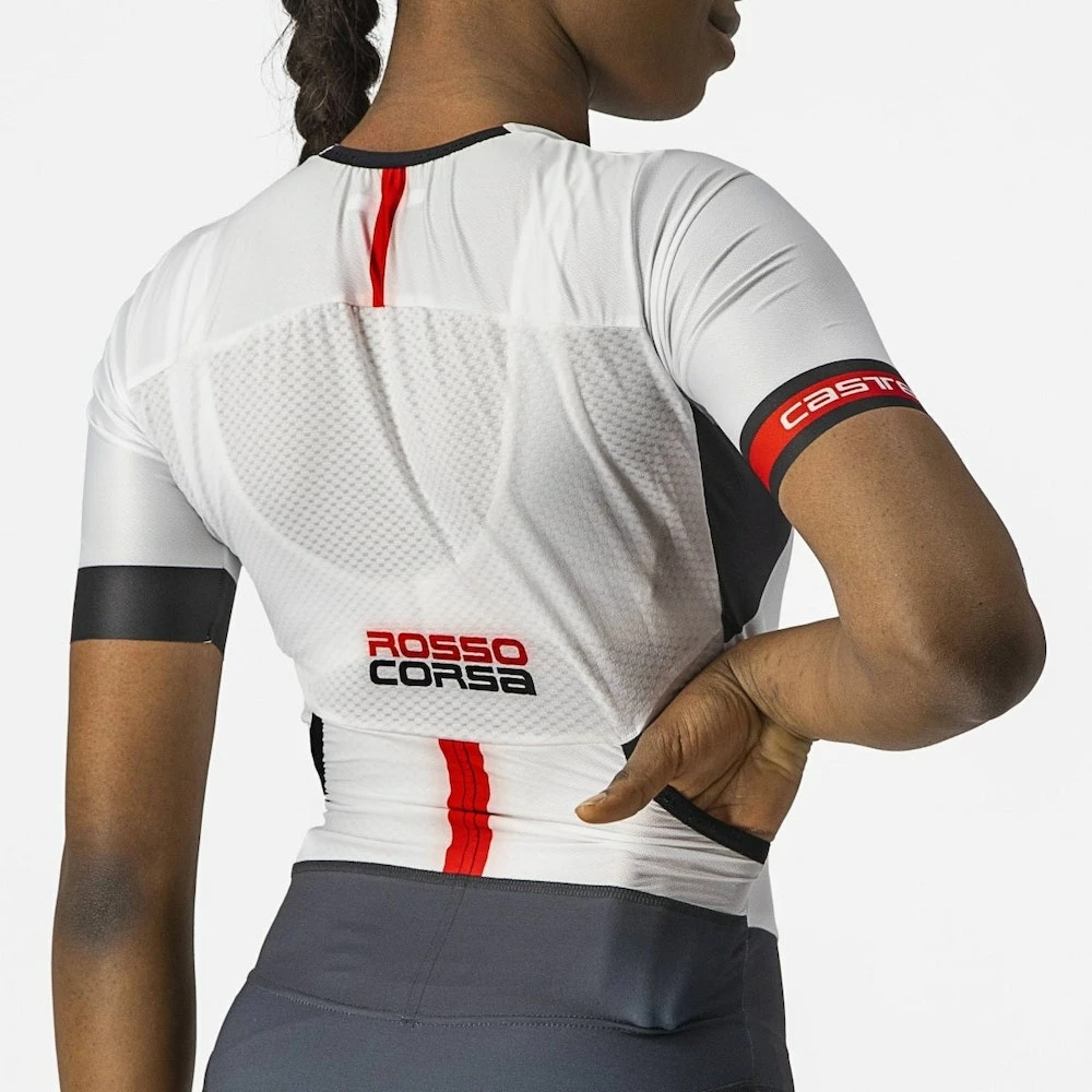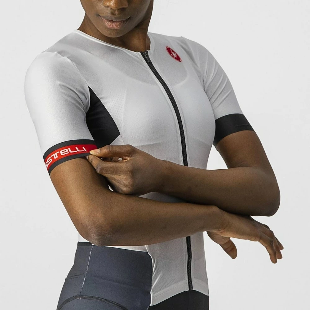 Castelli’s Sanremo front opening makes it easier to bend for cycling and straighten out for the run and swim