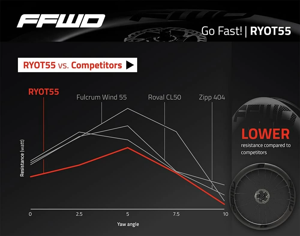 The RYOT55 is THE wheel set for the cyclist that demands speed beating the competition by up to 2.7 watts.
