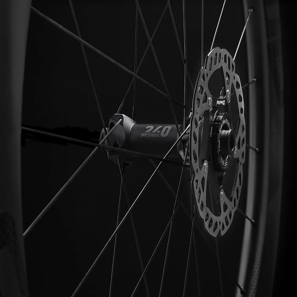 The RYOT55 is built with DT Swiss’ newest DT240 EXP straight pull center-lock hubs featuring a 36 tooth star ratchet system offering 10 degrees of engagement for quick and crisp shifting, DT Swiss Aerolite and Competition spokes, DT Swiss brass nipples and 12mm thru axle (12/100mm, 12/142mm) as standard.