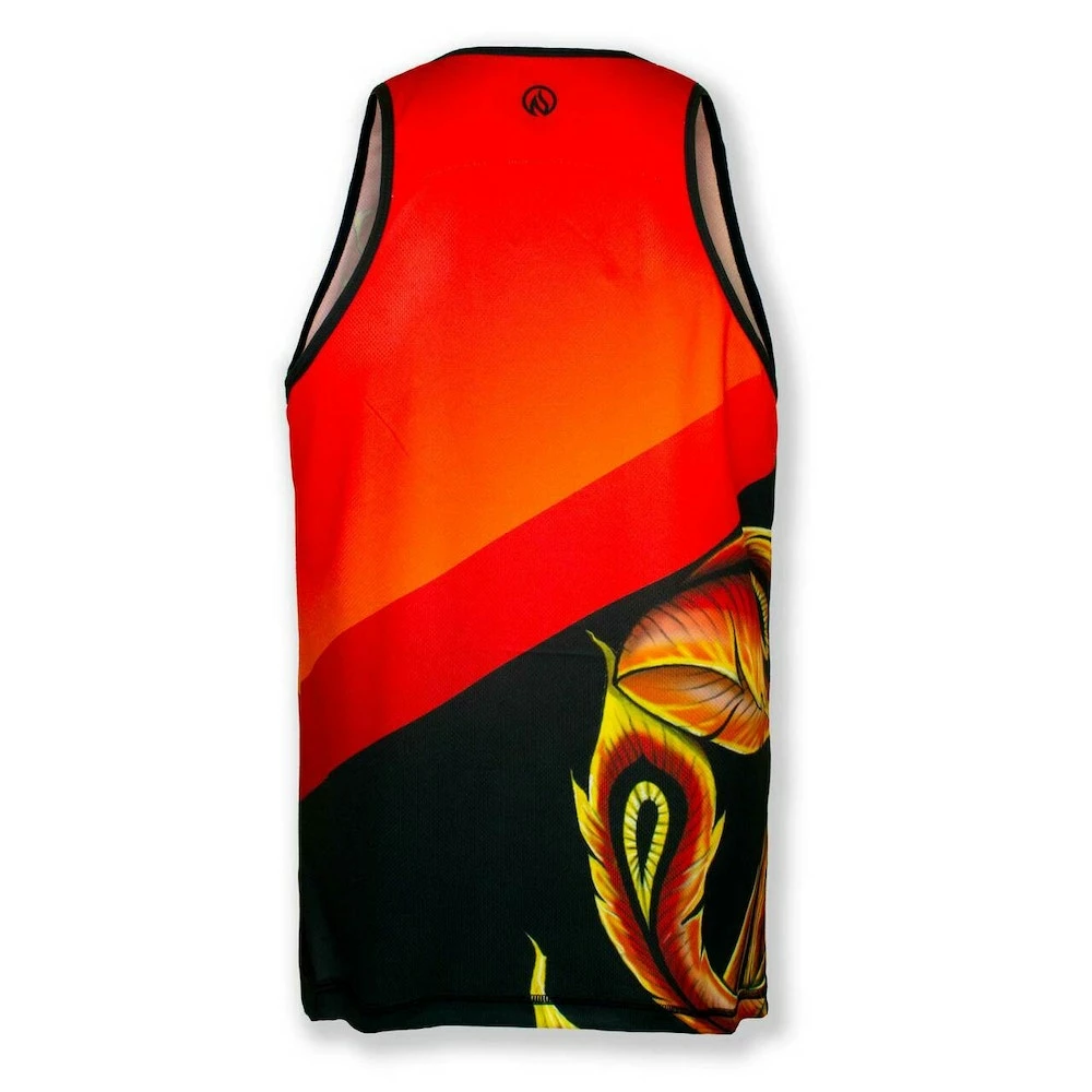 The fiery Phoenix Singlet is the perfect symbol for making a comeback… rising from the ashes and spreading your wings to take on new challenges. This light-weight, race-cut singlet is designed for speed, but also works well as a cool, kick-back summer top that won’t show sweat! Vibrant art you can’t feel, on its super-light, moisture-wicking Dry I.C.E. Fabric. 100-Mile tested by ultra runners for comfort at extreme distance and a unique, head-turning design.