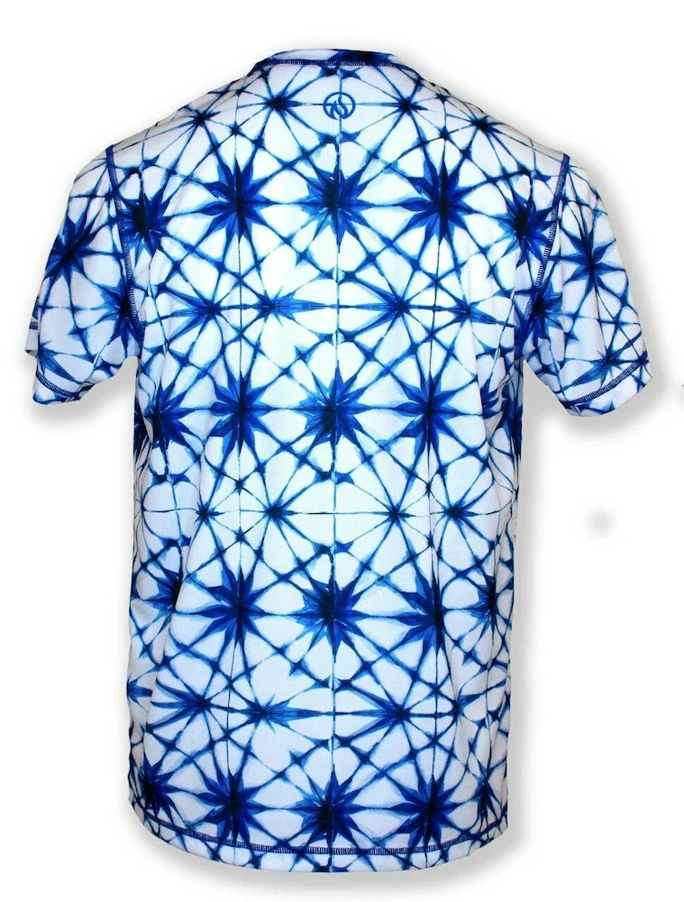 Shibori is an ancient Japanese tie dye technique that creates repeating patterns yet each “star” has its own unique bleed of the color. Cool blues, chill tie dye and a reminder to let yourself self shine. This light-weight, tech shirt is designed for speed, but also works well as a cool, kick-back top that won’t show sweat! INKnBURN apparel doesn’t fade, so this tech will look great years from now! Vibrant art you can’t feel, on our super-light, moisture-wicking Dry I.C.E. Fabric. 100-Mile tested by ultra runners for comfort at extreme distance and a unique, head-turning design.