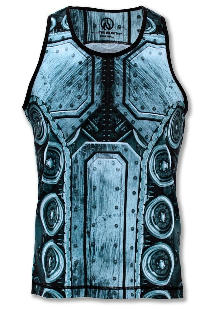 Feel indestructible and still stay cool in this INKnBURN original Men’s Tank Tank! Ok, it is a singlet like INKnBURN’s other Men’s Dry I.C.E. Athletic tops, but with the heavy duty industrial art inspired by the moving parts of a tank… forgive us for the pun. This steel plated singlet in cool metallic tones is the perfect armor for your next battle with yourself over whether or not to workout.