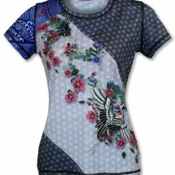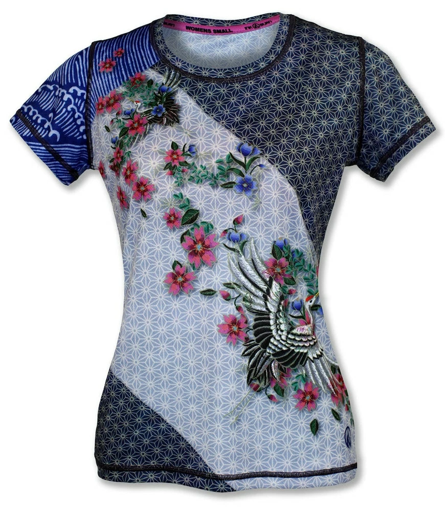 This Women’s Kaze Tech Shirt features royal cranes and pink cherry blossoms drifting across an asymmetrical composition of classic Japanese textiles. The combination of geometric and organic background patterns represent embracing both your analytical and emotional sides. In Japanese the word “kaze” means breeze, the perfect name for a shirt designed to give you the lift you need, to get through the toughest workouts, with style. This Dry I.C.E. Tech Shirt will keep you cool for any activity and won’t show sweat! Tested by ultra runners for comfort at extreme distance, this top will also get you through a tough day at work and won’t show sweat!