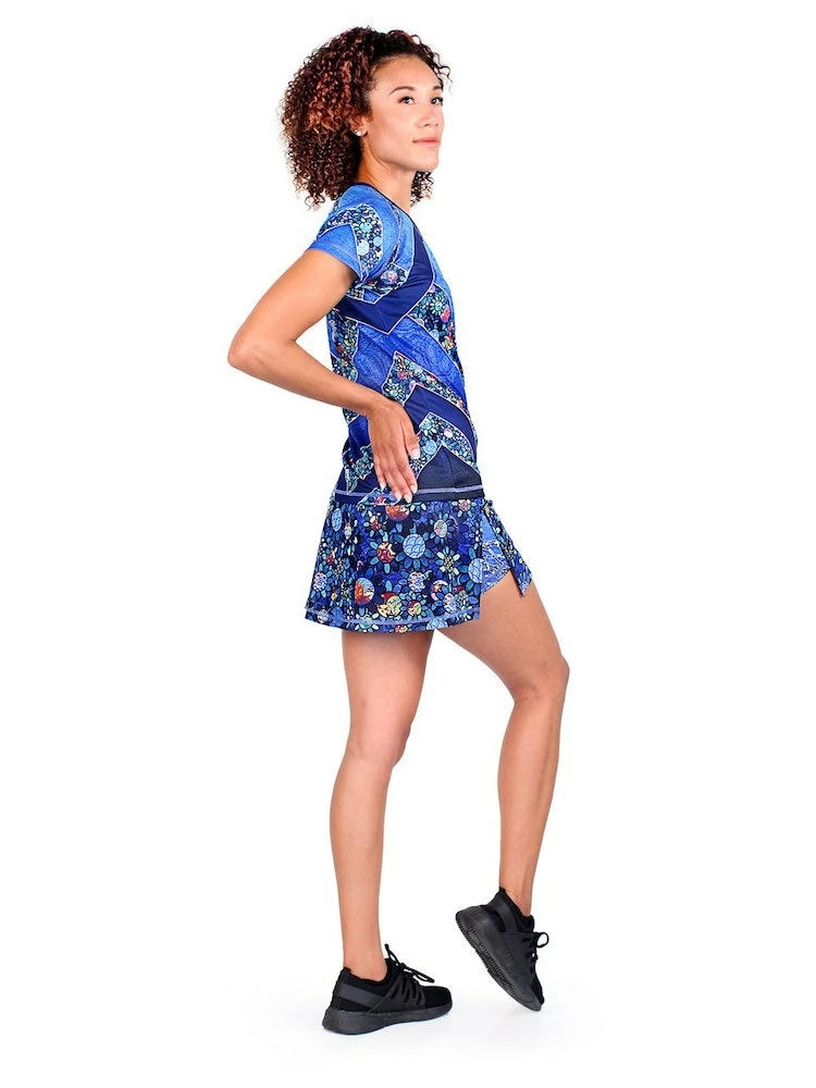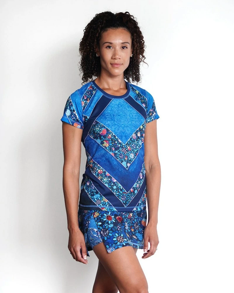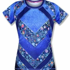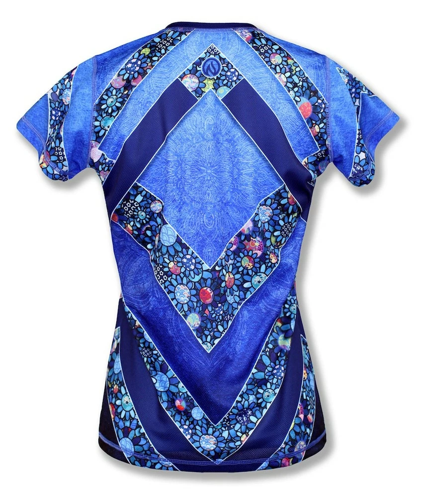 This Women’s Ladybug Tech Shirt features an adorable symbol of luck that you have to look closely to find! We created a floral design with the center of each flower featuring a different Japanese fabric pattern then hand-placed each flower. There are just a few ladybugs hidden among the flowers that fill up the form-flattering chevrons. Made with INKnBURN’s proprietary Dry I.C.E. Fabric, this top is light, cool and so comfortable you will want to workout more just so you can wear it!