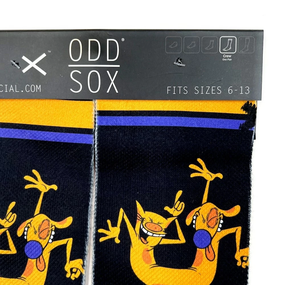 Brand new, in packaging CATDOG NICKELODEON ODD SOX CREW SOCKS • Unisex Mens/Womens sizes 6-13 • Crew height • Black, orange, purple • Image of Catdog on front & back • 92% polyester, 5% cotton, 3% spandex.