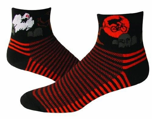 SOS Socks standard design is anything but standard. Save Our Soles uses core-spun COOLMAX fabric which is the best of both worlds; unsurpassed moisture management and LYCRA sport stability. SOS specific knitting machines place the COOLMAX fabric on the inside of the socks where it controls moisture from the foot; while the 3-ply nylon is used on the outside of the sock for strength and durability. The core-spun yarn is the most efficient way of knitting LYCRA fabric into the foot of the sock and still allow both the COOLMAX fabric and nylon to be sandwiched together. The cool designs are just a disguise; it’s a unique construction of the best materials and is unmatched anywhere.