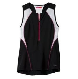 Terry’s full coverage, sleeveless tri top made of fast dry nylon poly/mesh for use over your own sport bra. XS-2XL. Made in USA.