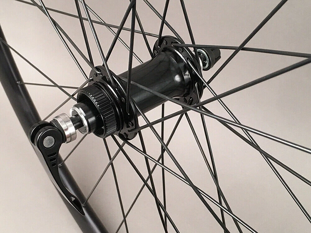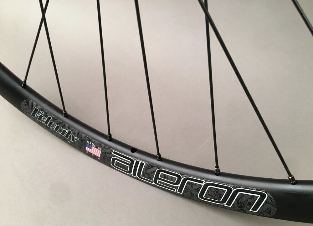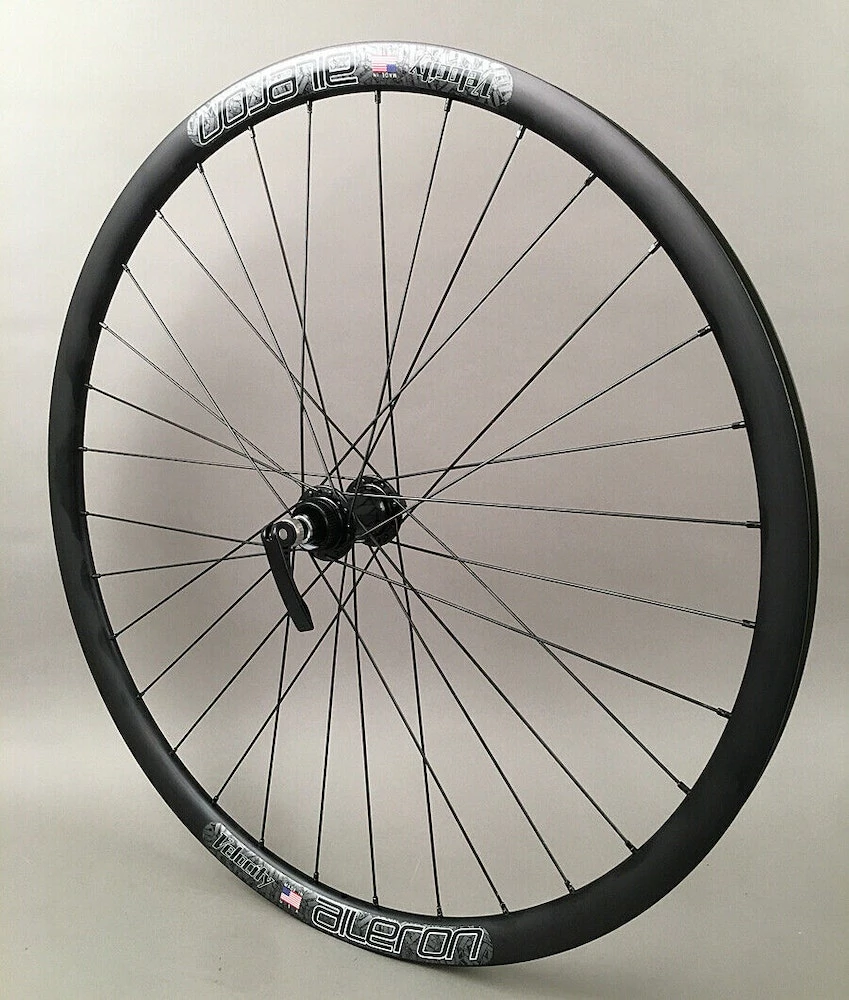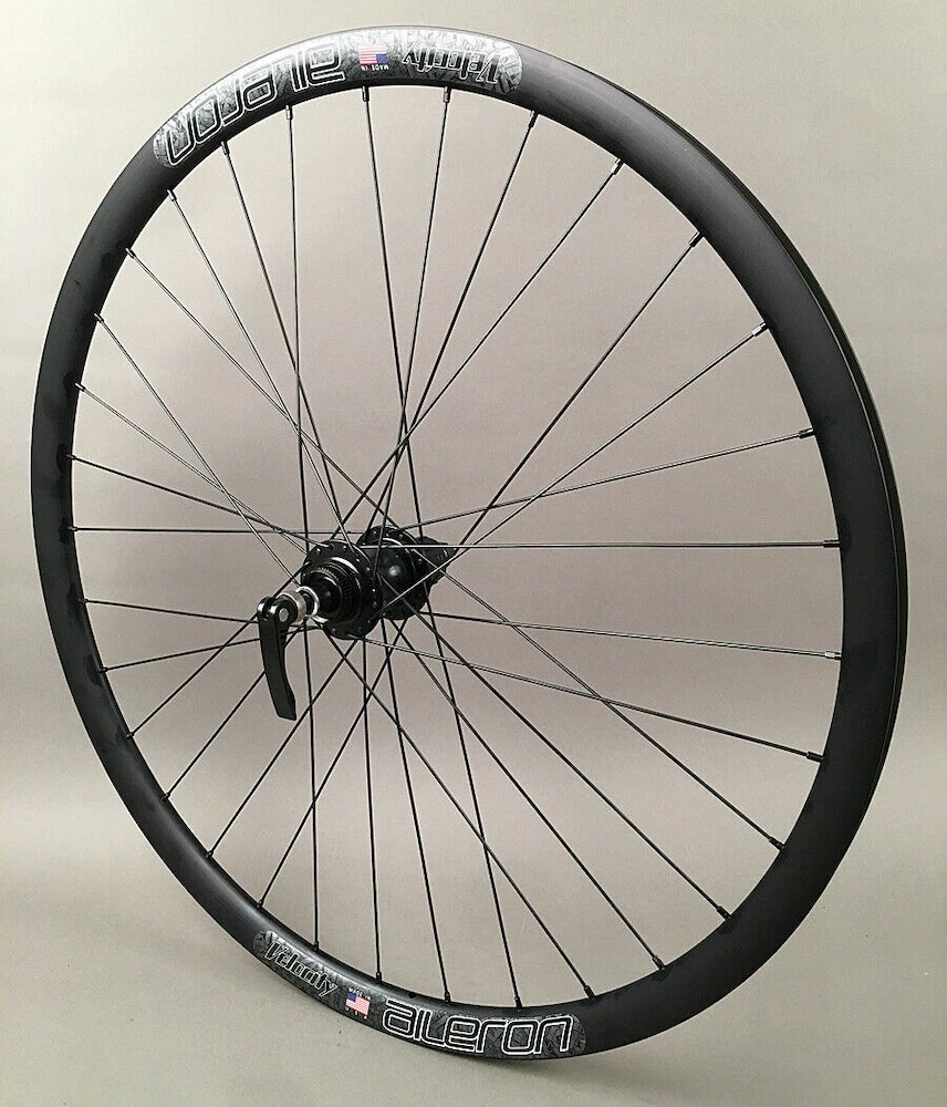 Velocity Aileron Disc tubeless ready wheelset. Suitable replacement for entry level to higher-end road and gravel bikes. The wheels come out of the box ready for quick release, but they include thru axle caps for 15 x 100mm in the front, and 12 x 142mm in the rear.