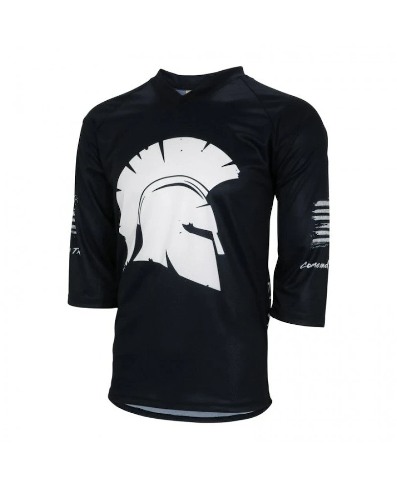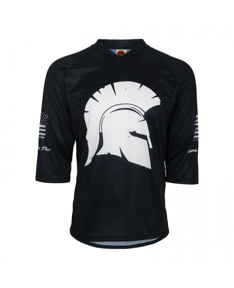 Made out of Dry Sport Polyester fabric for full breathability. 3/4 length sleeves. No pockets, no elastic just a loose fitting mountain bike style jersey with a V Neck collar.